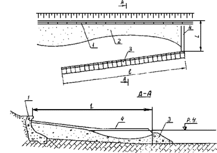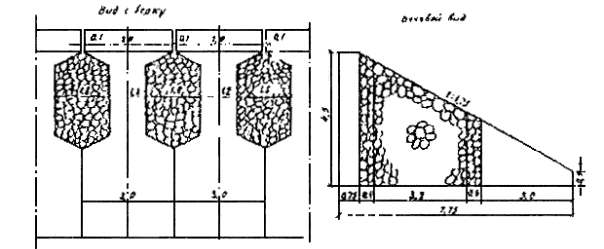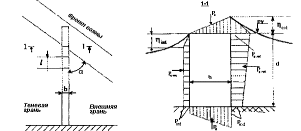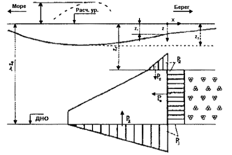= P2, (6.6) где: Z1 - ордината верха сооружения, м; Z2 - ордината подошвы волны, м, определяемая по табл. 16 п. 3.1 главы 3 СНиП 2.06.04-82* [1]; Z3 - ордината поверхности воды за упорным элементом подводного банкета, м, определяемая по формуле (73) п. 3.1 главы 3 СНиП 2.06.04-82* [1]; Z4 - ордината гребня волны перед упорным элементом подводного банкета, принимаемая по табл. 16 п. 3.1 главы 3 СНиП 2.06.04-82* [1]. Рисунок 6.2 - Эпюры волнового давления на упорный элемент подводного банкета 6.2.9 Нагрузки и воздействия на проницаемые берегозащитные сооружения, представляющие собой относительно тонкую проницаемую стенку, которая может состоять из колонн или свай с зазорами между ними, железобетонных плит с отверстиями, ступенчатых конструкций и др. определяются согласно рекомендациям, изложенным в методике [18]. Схема взаимодействия волн с
