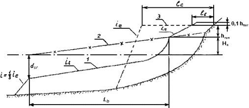 В формуле (22) величина tgje принимает значение в зависимости от места обрушения: tgjcr - на изобате первого обрушения расчетной волны, tgjn - на изобате ее последнего обрушения (наката). 13. Средний уклон берегового откоса в зоне наката рассчитывается по формуле [43]: