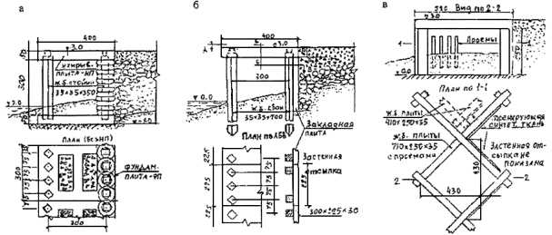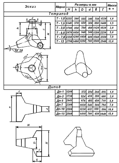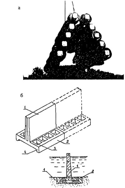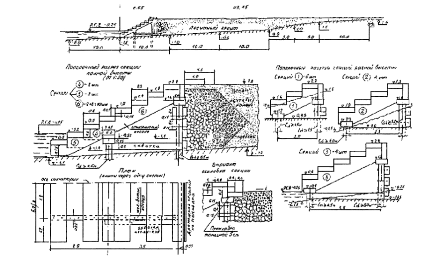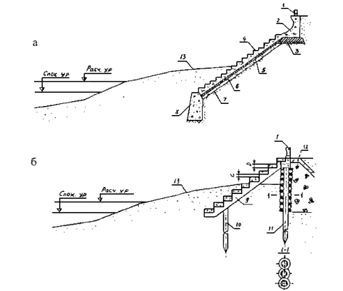 породам, не нарушенным трещинами; большие - полускальным (аргилитам и др.). Расчеты сооружений на устойчивость и прочность производятся на допускаемые нагрузки. 6.1.3 Расчетные элементы волн следует принимать с учетом подверженности берегозащитного сооружения воздействию необрушенных, обрушающихся или разрушенных волн, а также с учетом геометрических характеристик, проницаемости и сквозности сооружения. Интенсивность волнового воздействия, испытываемого сооружением, может изменяться вдоль сооружения с изменением уровня воды и во времени (в ходе шторма и в течение волнового периода). Поэтому волновые условия должны быть определены в разных сечениях вдоль сооружения и при разных уровнях воды. 6.1.4 Для проверки устойчивости морских берегозащитных сооружений из гравитационных массивов на сдвиг рекомендуется принимать следующие значения коэффициентов трения бетона по основанию: по поверхности прочной скалы и каменной наброски - 0,50, по известнякам и песчаникам - 0,30 - 0,45, по галечно-песчаному грунту береговых отложений - 0,40, по пескам пляжевых отложений - 0,30, по плотным глинистым сланцам и мергелям с неомыливающейся поверхностью - 0,25 - 0,35, по глинам и суглинкам, а также глинистым сланцам и мергелям и другим грунтам с смыливающейся поверхностью - 0,20 - 0,25. 6.1.5 Глубину заложения подошвы бун и подводных волноломов следует назначать с учетом свойств грунтов основания по табл. 6.1, а также с учетом долговременных и сезонных понижений поверхности пляжа и подводного берегового склона. 6.1.6 Принятые в проекте глубины размыва в нескальных грунтах должны обосновываться материалами изысканий, в том числе результатами анализа береговых процессов, и опытом строительства морских берегозащитных сооружений. Глубина размыва в скальных грунтах условно принимается равной верхнему слою породы, разрушенному физико-механическими процессами. 6.1.7 Величину заглубления подошвы фундамента гравитационных сооружений ниже расчетной глубины размыва необходимо принимать с учетом класса берегозащитных сооружений по табл. 6.1. 6.1.8 Подошва фундамента волноотбойных стен, корневых частей бун и траверсов должна располагаться на 0,2 - 0,3 м ниже глубины промерзания грунтов. 6.1.9 В случае, если грунты в основании берегозащитного сооружения не удовлетворяют требованиям несущей способности или устойчивости против размыва, следует предусматривать их замену каменными постелями. 6.1.10 При проектировании оснований берегозащитных сооружений следует учитывать, что каменная постель может подвергнуться разрушению при воздействии на нее фильтрационных течений, возбуждаемых волнами, поэтому защитный слой постели или берменные плиты своей массой должны надежно пригружать постель и обеспечивать се устойчивость. Глубина заложения подошвы постели должна быть больше максимальной глубины размыва на величину запаса согласно табл. 6.1. 6.2 Нагрузки от ветровых волн6.2.1 Нагрузки и воздействия волн на сооружения откосного профиля определяются согласно положениям пп. 1.14 - 1.19 главы 1 СНиП 2.06.04-82* [1]. 6.2.2 Нагрузки от ветровых волн на подводный волнолом определяются согласно положениям п. 3.1 главы 3 СНиП 2.06.04-82* [1]. 6.2.3 Максимальную донную скорость перед берегоукрепительным сооружением определяют согласно положениям п. 3.2 главы 3 СНиП 2.06.04-82* [1]. 6.2.4 Нагрузки от волн на вертикальную стенку не