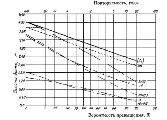 вероятности превышения (обеспеченность) расчетных уровней и высот волн,