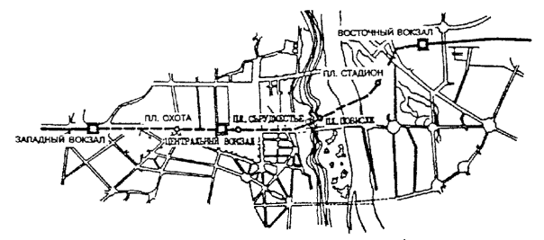 и Восточный вокзалы; промежуточные пересадочные станции: Охота, Сьрудместье,
