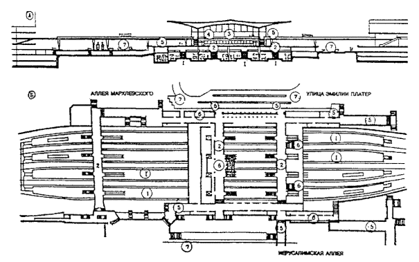 разрез, Б - план подземного этажа; 1 - подземные пассажирские платформы; 2