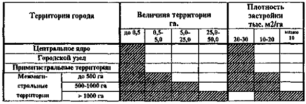 дифференцированную для центрального ядра города, городских узлов, примагистралъных и межмагистральных