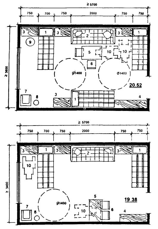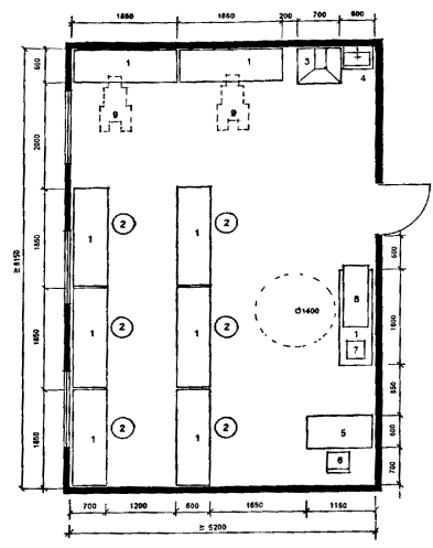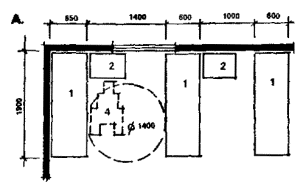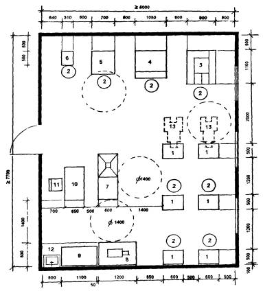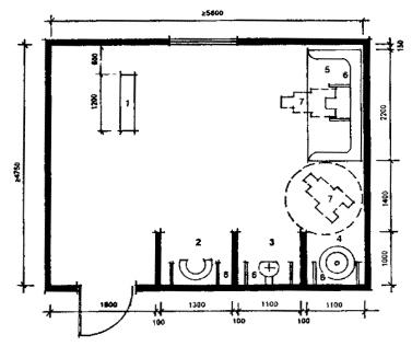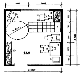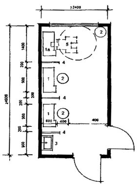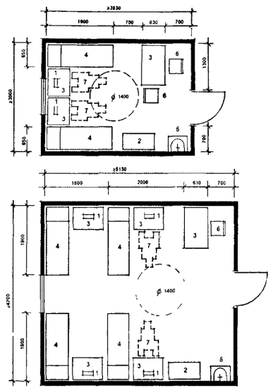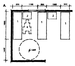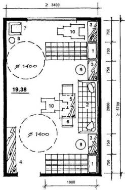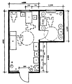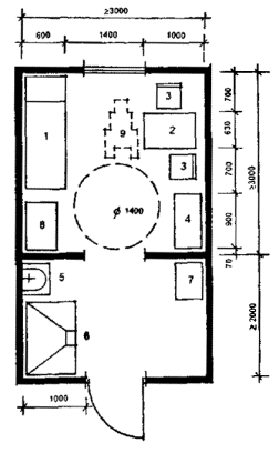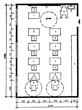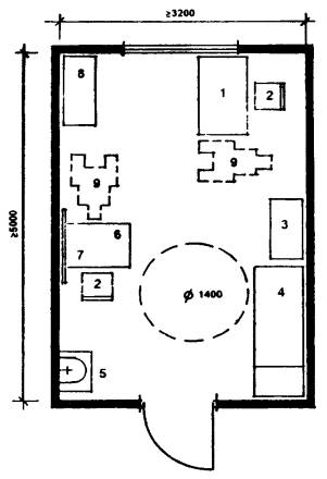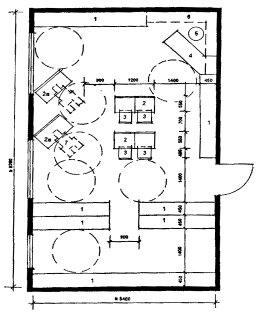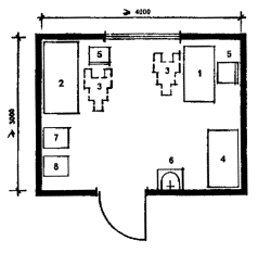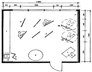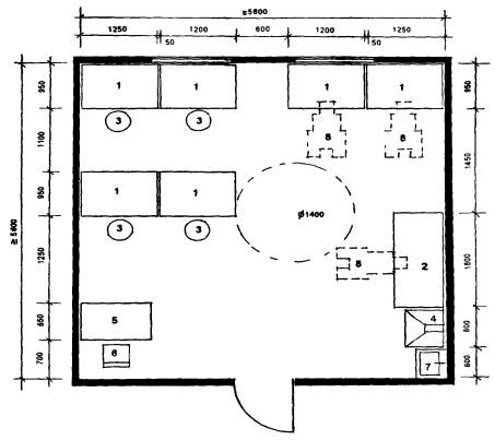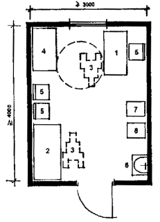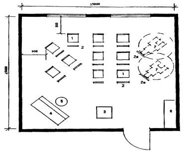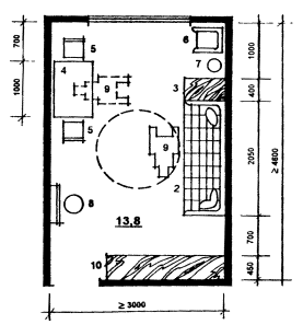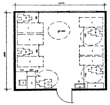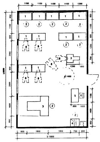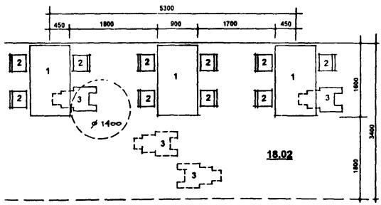2,25 м2/1место ЭКСПЛИКАЦИЯ ОБОРУДОВАНИЯ 1. Стол 2. Стул 3. Инвалидная коляска рис. 8.1. примеры