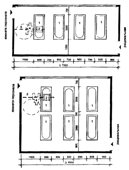 ПЛАНИРОВОЧНЫЕ СХЕМЫ ВАННЫХ ЗАЛОВ НА 4 И 6 ВАНН