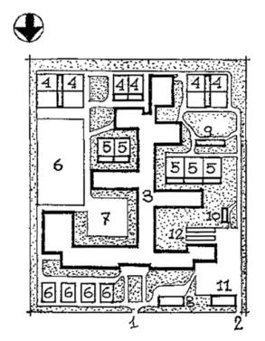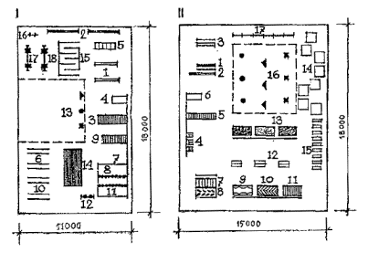 РЕКОМЕНДАЦИЯМ ЦНИИЭП УЧЕБНЫХ ЗДАНИЙ): I. ГИМНАСТИЧЕСКАЯ ПЛОЩАДКА: 1 - бревно на грунте; 2 - бревно на стойках; 3 - доска на грунте; 4 - скамья; 5 - наклонная лестница; 6 - наклонная доска; 7 - брусья; 8 - перекладина; 9 - рукоход; 10 - шесты; 11 - кольца; 12 - ориентиры на грунте для построения детей; 13 - шведские стенки; 14 - вертикальные гимнастические лестницы; 15 - доска с планочками II.