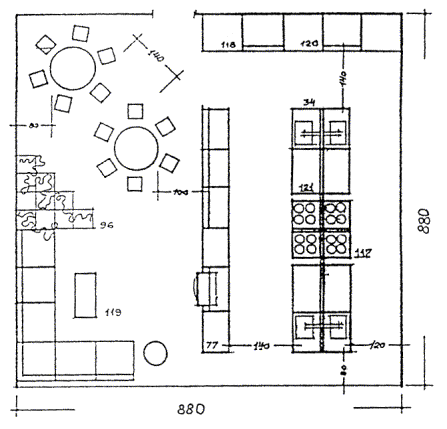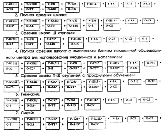 (Приложение 21 МГСН 4.06-96) Кухонный блок школьного обеденного зала может решаться в двух вариантах: с приготовлением пищи на сырье и на полуфабрикатах, с ориентацией на городскую кухню школьной базовой столовой. Б) Правила формирования из блок-модулей функциональных групп помещений различных видов общеобразовательных учреждений.7.5. Сочетание между собой программных блок-модулей функциональных групп помещений дает возможность формировать многообразные по содержанию и назначению виды и типы общеобразовательных учреждений по материальной среде, отвечающей поставленным педагогическим задачам, в т.ч. дифференцированному профилированному обучению в старших классах: физико-математическое, техническое; химико-биологическое, биоэкологическое; экономическое и т.д. (см. табл. 12). 7.6. Состав помещений общеобразовательных учреждений формируется из основных функциональных групп помещений согласно табл. 11 и 12. Состав помещений основной школы I - III ступеней комплектуется из приведенных основных функциональных групп за вычетом У-КСШ, ОРЦ, сокращенного состава помещений У-СК и У-ТМ, минимальной библиотеки группы У-ЦИ, сокращенного состава помещений по функциональным группам О-ХВ, О-ТТ, О-БО, О-СЗ, О-Б. Состав помещений средней общеобразовательной школы I, II и III ступеней комплектуется в соответствии с табл. 11 и 12 за вычетом помещений рассчитанных на профильное обучение. Состав помещений средних общеобразовательных школ II - III ступеней с профильным обучением комплектуется в соответствии с. табл. 11 и 12 за вычетом функциональных групп соответственно У-КНШ с расширенным набором помещений основных функциональных групп, определяющих направление профилизации. Состав помещений средней школы I, II и III ступеней обучения с профильным обучением комплектуется аналогично средней общеобразовательной школе, но с расширенным составом помещений, связанных с профильным обучением. Состав помещений гимназии в составе II - III ступеней принимается за вычетом функциональных групп У-КНШ. Кроме того, сокращается набор помещений функциональная группа У-СК и У-ТМ. Одновременно расширяется состав помещений группы художественного воспитания О-ХВ за счет включения в нее ряда универсальных студий. Принимается расширенная группа У-ЦИ (библиотека) и группа О-БО по экологии. ПРИМЕРЫ ФОРМИРОВАНИЯ ФУНКЦИОНАЛЬНЫХ ГРУПП ПОМЕЩЕНИЙ В ОБЩЕОБРАЗОВАТЕЛЬНЫХ УЧРЕЖДЕНИЯХ РАЗЛИЧНОГО НАЗНАЧЕНИЯ. 1. Основная школа: