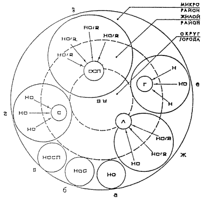 2734-8-16). 5.19. Переход на трехступенчатую систему обучения в общеобразовательной школе влечет за собой усложнение формирования сети зданий и, как следствие, многообразие типов зданий как по организационно-педагогической структуре, так по количеству классных помещений. Принципиальные модели организации сети зданий общеобразовательных учреждений в городе приведены на рисунке 1. (а) - В микрорайоне размещается основная школа "НО" в составе школ I и II ступеней обучения (I - ХI классы). Она приближена максимально к жилой группе зданий. При этом учащиеся старших классов продолжают обучение в школе III ступени (градостроительный уровень - "жилой район"). (б) В микрорайоне размешается полная средняя общеобразовательная школа "НСС", которая организационно не связана со школами III ступени обучения. (в) - В микрорайоне базовой школой является полная средняя школа в составе I, II и III ступеней обучения с дифференцированным (профилированным) обучением ("НОСП"). Функционирует автономно от остальной системы общеобразовательных учреждений. (г) В жилом районе размещается средняя школа III ступени ("С") с увеличенным числом параллелей старших классов для обслуживания сети основных школ. (д) - В жилом районе базовой школой является сетевая школа II и III ступени обучения с дифференцированным (профильным) обучением "ОСП", которая предназначена для обслуживания начальных и основных школ, рассчитана в основном на обслуживание сложившейся сети школ (см. п. 2 "Градостроительный аспект"). (е) В районе или вне его размешается гимназия "Г" в составе школ II и III ступеней, которая охватывает учащихся, оканчивающих начальные классы соседних школ. (ж) В районе или вне его размешается лицей "Л" в составе школ II и III или III ступеней, предназначен для обслуживания основных школ. Внешкольные учреждения.5.20. Внешкольное воспитание (дополнительное образование) является неотъемлемой частью общего образования и осуществляется в целях создания условий для творческой деятельности, развития одаренных детей, укрепления здоровья, полноценного использования свободного времени, отдыха и общения учащихся. Внешкольные учреждения, в первую очередь, являются организационно-массовыми центрами разнообразной внеучебной деятельности с детьми и подростками в школах. Одновременно они рассматриваются и как база проведения кружковой работы на более совершенной материальной основе и изучения современных технологий. 5.21. Сеть внешкольных учреждений (собственно внешкольные учреждения и учебно-производственные мастерские и комбинаты) в городе формируется в зависимости от численности населения, числа учащихся школьного возраста, с учетом местных условий. При организации сети следует руководствоваться также примерным перечнем внешкольных учреждений различных ведомств: Центр внешкольной работы и детского творчество; Дом школьников и учащейся молодежи; Экологический центр учащихся; Станция (Дом) юных натуралистов; Центр (Дом, Клуб) технического творчества; Станция (Дом, Клуб) юных техников; Школы: математическая, физико-техническая и по другим отраслям науки и техники (не дающие общеобразовательной подготовки); Центр детского и юношеского туризма и экскурсий; Станция (Дом, база) юных туристов; Дворец спорта для детей и юношества; Детский стадион; Детско-юношеская спортивная (спортивно-техническая)