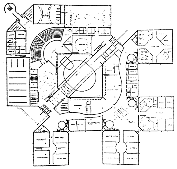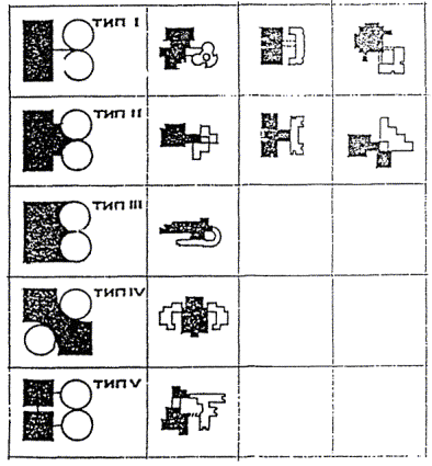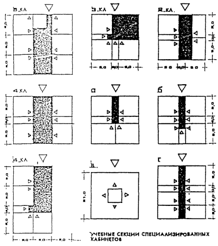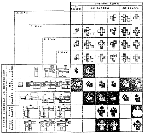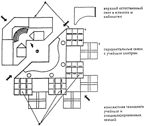Учебная группа рассчитывается на создание максимально благоприятных условий для обучения учащихся по системе "ученик - группа - класс -поток". Отсюда расширение библиотеки с учетом индивидуальных самостоятельных форм работы, групповое обучение в классе-кабинете с повышенной нормой площади по отношению к фронтальным видам работ. Площадь учебно-информационного центра - библиотеки принимается по максимальной норме. Лекционная аудитория проектируется с числом мест на одну возрастную параллель учащихся по 1 м2 на место. Практические формы работы, являющееся основой профильного обучения, должны обеспечивать долговременное проведение практическо-исследовательских работ, соответствующих направленности дифференцированного обучения. По естественным наукам кабинеты решаются как комплексы в составе лаборатории, ряда практикумов и лаборантских. Практикумы принимаются с количеством мест в половину группы и числом не менее трех при одной лаборатории. Возможны дополнительные помещения практикумов на меньшее количество учащихся. Практикумы по изучению техники рассчитываются на 1/2 и 1/3 учащихся группы. 9. ОБЪЕМНО-ПЛАНИРОВОЧНОЕ РЕШЕНИЕ ЗДАНИЙА. Общие требования к структуре зданий.1. Функциональная модель школы должна быть построена по принципу организации уровней в части обслуживания учащихся от первичного элемента к целому организму и охватывать все звенья учебного и воспитательного процессов: - нижний уровень (повседневное обслуживание) - учебное помещение класс-кабинет; - второй уровень - группа учебных помещений, связанных между собой единым взаимодополняющим процессом (учебная секция, технологическая группа), в которой не все помещения используются в течении дня, но служат базой для организации полноценного обучения в течении недели; - третий уровень - группы учебных секций или технологических групп помещений, работающих в органической связи с информационно-методическим центром школы и отдельными специализированными учебными помещениями; используемыми в течении месяца и во внеучебное время; - четвертый верхний уровень как целое, предусматривает необходимое функционирование и органическое взаимодействие между Учебным комплексом, Информационно-методическим центром и Общешкольной группой помещений в течении полного дня, недели, месяца, года, в котором тесно переплетается учебная и внеучебная деятельность; обеспечиваются в конечном итоге разностороннее развитие личности и ее творческого потенциала. 2. В соответствии с функциональной моделью архитектурно-типологическая структура школы должна иметь следующую пространственную организацию: - Учебная группа <-> Информационно-методический центр <-> Общешкольная группа помещений (три комплекса связанных между собой в единое пространство с учетом их автономного функционирования и одновременно тесной связи); - Учебная группа помещений в свою очередь должна быть дифференцирована на школы I, II, III ступеней обучения и технологические группы помещений обслуживающие эти возрастные школы: - Общешкольная группа помещений должна быть подразделена на отдельные функциональные группы по назначениям - спорт, группа зрительного зала, технического творчества и биолого-опытнической деятельности, художественного воспитания (музыка, изобразительное искусство, хореография) и быт