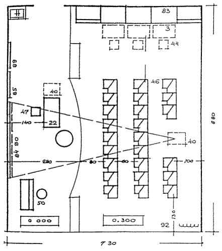 (Приложение 15 МГСН 4.06-96) Группа зрительного зала состоит из собственно зрительного зала, эстрады, кладовой - инвентарной, артистической - костюмерной, киноаппаратной, технического центра, лекционной аудитории. Зрительный зал следует проектировать с учетом использования его в качестве киноаудитории, учебной аудитории, занятий по музыке и пению, а эстраду использовать для хореографии. По минимальному варианту в общеобразовательной школе следует предусмотреть зал, эстраду, киноаппаратную, технический центр. Расширенный (полный) состав предусматривается в сетевых общеобразовательных профильных школах, гимназиях, лицеях. В гимназиях искусств принимается расширенная эстрада для организации выступлений и концертов.