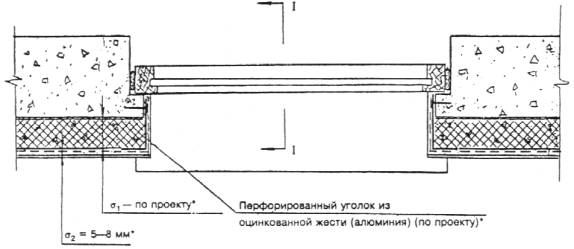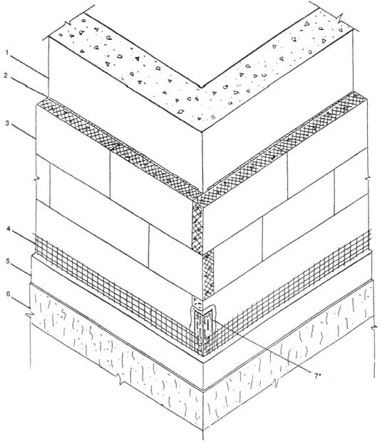 утеплителю _____________ * Контролируемый параметр Рисунок А9. - Крепление теплоизоляционного слоя на нижней части стены _____________ * Контролируемый параметр Рисунок А10. - Фрагмент утепления нижней (и ее заглубленной) части стены здания 1 - загрунтованная поверхность стены; 2 - клеящий состав; 3 - плиты утеплителя; 4 - арматурная сетка из стекловолокна (по проекту)*; 5 - нижний слой тонкой штукатурки; 6 - отделочный декоративный слой; 7 - металлический перфорированный уголок, установленный на клеящий состав (по проекту)* _____________ * Контролируемый параметр Рисунок А11. - Фрагмент конструктивного решения теплоизоляционного покрытия угловой