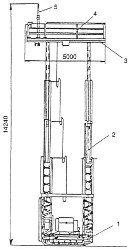 Подмости ПВС-12 1 - база; 2 - телескопическая колонна; 3 - платформа; 4 - ограждение; 5 - кран Техническая характеристика Грузоподъемность площадки, кг.................................. 600 Высота подъема