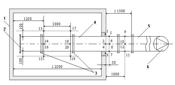 Схема размещения горизонтальных воздуховодов на испытательном стенде: 1 - печь; 2 - заглушенный торец образца; 3 -