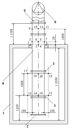 размещения вертикальных воздуховодов на испытательном стенде: – 1-4 - на поверхности уплотнений воздуховода в проеме печи; – 5-12 - на необогреваемых поверхностях воздуховода; – 13-20 - в печи