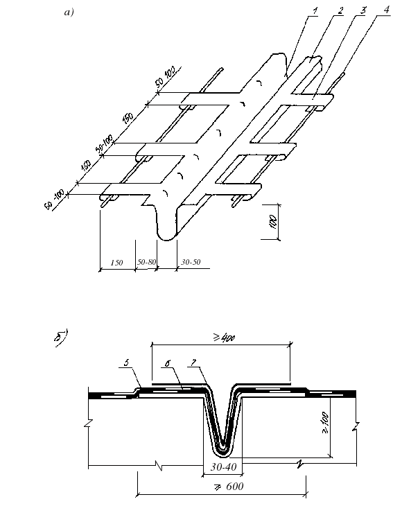 без оклеечной гидроизоляции и с металлическим окаймлением; 1 - цементобетонное покрытие; 2 - гидроизоляция; 3 - выравнивающий слой; 4 - мастика заполнения; 5 - анкерный стержень; 6 - компенсатор; 7 - пористый заполнитель; 8 - металлическое окаймление; 9 - арматурный каркас; 10 - вертикальные анкера 2.2. Деформационные швы закрытого типа содержат: металлический (или неметаллический) компенсатор, закрепленный на концах пролетных строений и предназначенный для удержания заполнения; гидроизоляционный слой, дополненный полиэтиленовой пленкой, стабилизированной сажей и заведенный в петлю компенсатора; пористое заполнение петли компенсатора; уплотнитель зазора в уровне защитного слоя из пенопласта или дерева, предназначенный для предотвращения вдавливания покрытия в зазор; армированное или неармированное асфальтобетонное покрытие, уложенное без разрыва. Металлический компенсатор вырезают из латунного листа или оцинкованного железа толщиной 1,0-1,2 мм и придают ему форму лотка, В пролетном строении компенсатор закрепляют с помощью горизонтальных анкерных полос, соединяемых с продольной арматурой (рис. 3а). Неметаллический компенсатор состоит из двух слоев гидростеклоизола, склеенных между собой мастикой и приклеенных к выравнивающему слою (рис. 3б). Допускается оставлять в деформационном шве металлические компенсаторы иной формы и размеров, если они находятся в удовлетворительном состоянии. При этом дополнительно устраивают неметаллический компенсатор. Уплотнитель, применяемый в швах закрытого типа (см. рис. 1), может быть выполнен из доски повышенной влажности или пенопласта. Одновременно он является опалубкой для выравнивающего слоя (рис. 4). 2.3. Деформационные швы заполненного типа содержат: металлический компенсатор предназначен для удержания заполнения, состоит из гнутой тонколистовой стали толщиной 2-2,5мм, закрепляется с помощью накладок (с шагом не более 0,6 м), приваренных к закладным деталям, либо оголенной арматурой; неметаллический компенсатор (см. рис. 3б и п. 2.2) расположен по верху металлического, служит для отвода воды из шва и закрыт сверху слоем гидроизоляции; пористое заполнение петли компенсатора уменьшает расход мастики; заполнение в виде мастики или пасты в уровне защитного слоя и покрытия (либо в уровне только асфальтобетонного покрытия, если его толщина превышает 5 см) обеспечивает герметичность шва; металлическое окаймление шва применяют для защиты кромок бетонного прилива в пролетных строениях на дорогах (I и II категории) с большой интенсивностью движения автомобилей. Рис. 3. Металлические (а) и неметаллический (б) компенсаторы деформационных швов: 1 - лотковая часть компенсатора; 2 - полка