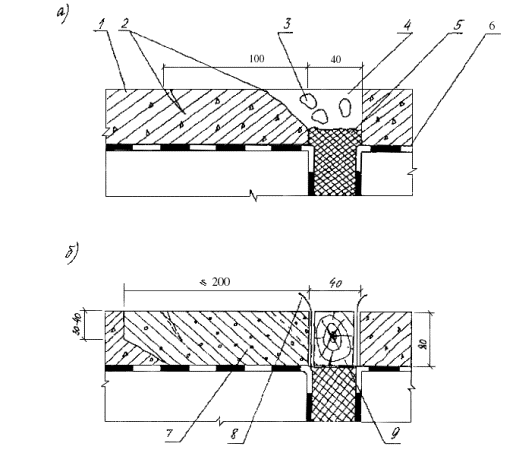 свежеуложенный бетон; 8 - полиэтиленовая пленка; 9 - закладная доска Бетонную смесь кладут выше уровня покрытия на 0,25-0,3 глубины вырубки. Смесь уплотняют поверхностным вибратором, отделывают гладилкой, кельмами и терками. При использовании цементобетонных смесей ремонтные работы выполняют при температуре окружающего воздуха не ниже +5°С, а асфальтобетонных - не ниже -5°С. 5.5. Восстановление слоев одежды мостового полотна у швов закрытого типа. При наличии трещин, бугров и появлении признаков просачивания воды через шов закрытого типа его следует вскрыть, удалить покрытие, а также грязь из компенсатора и разрушенную мастику, затем заполнить зазор новой мастикой, уплотнить доской (рейкой) зазор в уровне защитного слоя и перекрыть шов асфальтобетонным покрытием. Основные этапы работ по замене покрытия над швами закрытого типа приведены на рис. 8а. Асфальтобетонное покрытие вырубают на ширину, превышающую ширину поврежденного участка на 0,6 м, но не менее 1 м (см. рис. 8а). Длина вырубаемого участка вдоль шва на 0,4 м превышает половину габарита проезжей части. При отсутствии в конструкции шва уплотнителя в уровне защитного слоя, кромки бетона срубают под углом примерно 45° на 20 мм с каждой стороны. Зазор продувают, а наклонную грань защитного слоя выравнивают цементным раствором. После очистки зазоры заполняют мастикой и пористыми вкладышами. Вначале разливают мастику по стыкам шва, исходя из расхода 1,5-2,0 л на 1 м шва. Втапливают в мастику пористый вкладыш (гернит, поролон, канат). После укладки одной нитки разливают в зазоры между вкладышами и стенками второй раз мастику, которая не должна превышать уровень гидроизоляции. При глубокой петле компенсатора в зазоре могут быть проложены 2-3 нитки вкладыша, которые должны проходить до конца плиты крайней балки. В зазор в уровне защитного слоя заклинивают уплотнитель (см. рис. 8б); все щели заливают мастикой. При ширине зазора до 25 мм кромки защитного слоя можно не скалывать, а в качестве уплотнителя можно использовать доску (рейку) соответствующей толщины без скосов под клин. При толщине защитного слоя более 40 мм уплотнитель следует делать составным из доски и набитых на нее реек, опирающихся на скошенные кромки шва. Верх уплотнителя не должен находиться выше верха защитного слоя. Перед укладкой покрытия поверхность защитного слоя очищают, на уплотнитель приклеивают один слой гидростеклоизола, а всю поверхность врубки грунтуют. К ремонтным работам целесообразно готовить сразу несколько швов с тем, чтобы асфальтобетонное покрытие укладывать и уплотнять на большей площади. Рис.