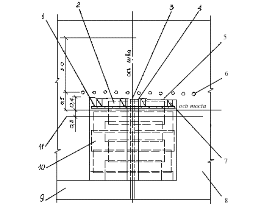 слой гидроизоляции; 9 - полиэтиленовая пленка; 10 - тротуар; 11 - ось моста; 12