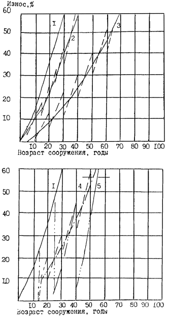 2. Графики долговечности моста с ж/б пролетными строениями: а) при условии ухода (линия 2) и ухода с