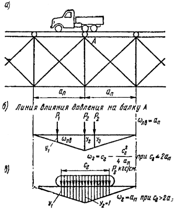 Суммы ординат под продольными рядами колес одного автомобиля и площади линий влияния для определения грузоподъемности свайных опорПятисвайная опора