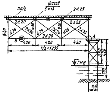 опоры располагают в середине пролета под узлами ферм. При этом усиливают тяжи и