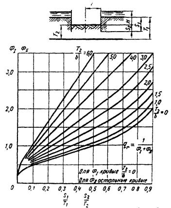 в случае близкого расположения водоупорного слоя (Ф1 определяется в функции