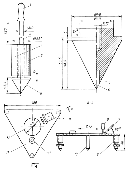 1 - рукоятка; 2 - ударник; 3 - груз ударника; 4- ролик; 5 - линейка; 6 - измерительный конус; 7 - зеркало; 8 - визир; 9 - регулируемая опора; 10 - опора; 11 - уровень; 12 - измерительное устройство; 13 – отверстие