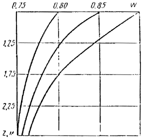 8 - верх образца грунта Вертикальную деформацию образца измеряют индикаторами часового типа (мессурами) с ценой деления 0,01 мм. Испытывают до полного промерзания образца, которое продолжается обычно около 4 сут. К этому времени показания мессур уже не изменяются, что указывает на окончание процесса промерзания. Терморегулятор обеспечивает заданную температуру в холодильнике, контролируемую датчиком (термометром), помещенным внутри холодильника над поверхностью теплоизоляции. Не рекомендуется часто открывать холодильник. Целесообразно сделать в его дверце окно из оргстекла, через которое можно наблюдать за показаниями термометра, и индикаторов. Показания индикаторов обычно фиксируют через каждые 6 ч. Если в процессе испытания пучение достигает предельного значения (например, 10 мм), индикаторы приходится переставлять; отсчеты записывают до и после перестановки. На основании показании индикаторов вычисляют коэффициент пучения грунта (в процентах) Кпуч = 100Dh/h, где Dh - размер вспучивания образца; h - начальная высота образца. Рекомендуется для контроля промораживать одновременно два образца одного грунта. Материалы, коэффициент пучения которых не превышает 1 %, можно считать практически не изменяющими объема при промерзании. ПРИЛОЖЕНИЕ 7ПРОВЕРКА НА МОРОЗОУСТОЙЧИВОСТЬ ДОРОЖНОЙ КОНСТРУКЦИИ ПРИ УСЛОВИИ z/H > 1Толщину слоев z1 из стабильных материалов, необходимую для обеспечения морозоустойчивости дорожной конструкции, при z/H > 1,0 определяют следующим образом. Для заданного вида грунта и типа местности по характеру увлажнения назначают группу грунта по степени пучинистости при замерзании (табл. 30). Затем по точке пересечения кривой (рис. 22) для данного вида грунта с ограничительной прямой соответствующей принятому типу покрытия, находят необходимую толщину z1cp слоев стабильных материалов для средних условий. Средние условия характеризуются параметрами: глубина промерзания z = 1,5 м, грунтовые воды выходят на поверхность, т.е. H = 0, а Купл = 0,98¸1,0 и W = 0,6 Wт. При других исходных данных требуемых по условию обеспечения морозоустойчивости общую толщину z1 дорожной одежды определяют с учетом ряда факторов, влияющих на морозное пучение грунта: z1 = z1срКугвКплКнагрКстКв, (27) где Кугв - коэффициент, учитывающий глубину залегания УГВ (см. рис. 19); z1ср - средняя толщина слоев из стабильных материалов; Кпл - коэффициент, зависящий от степени уплотнения грунта (табл. 31); Кнагр - коэффициент, учитывающий влияние нагрузки от собственного веса вышележащей конструкции на грунт в промерзающем слое и зависящий от глубины промерзания (см. рис. 18); Кст - коэффициент, учитывающий влияние структуры грунта естественного сложения (для песка равен 1,0; супесей - 1,1; суглинка - 1,2; глины - 1,3); Кв - коэффициент, зависящий от расчетной влажности грунта.