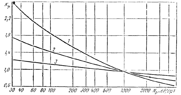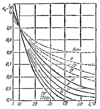 для испытания под колесом автомобиля, сплошными - под жестким штампом При существенном изменении конструктивных слоев одежды необходима новая тарировка. Обработка результатов испытаний. Время испытаний конструкций на контрольной точке, а также на характерном участке не совпадает со временем, когда температура слоев, содержащих органическое вяжущее, равна расчетной, т.е. +10° С. Поэтому измеренные прогибы l следует приводить к сопоставимому по температуре виду lс lс = lКо, (14) где l - измеренный прогиб; Ко - температурный коэффициент, принимаемый по графику (рис. 16). Так как время проведения линейных испытаний в отдельных местах характерных участком обычно тоже не совпадает по времени наибольшей потери прочности конструкцией в расчетный период, то результаты и этих испытании также следует приводить к сопоставимому виду. Такую корректировку выполняют с помощью графика изменения прогиба конструкции во времени (график «прогиб - время»), построенного по результатам ежедневных измерений прогиба на контрольной точке, приведенных к сопоставимому виду по температуре. Приведенный к сопоставимому виду прогиб покрытия на характерном участке линейных испытаний lпрi = ( где sji, sк - средине квадратические отклонения прогибов соответственно для характерного участка и для контрольной точки; tji, tк - коэффициенты нормированных отклонении, значения которых принимают для заданного уровня проектной надежности усиленной конструкции (табл. 28) и числа испытаний соответственно на характерном участке и ни контрольной точке; lкi - измеренный на контрольной точке прогиб в 1-й день, т. е. в день линейных испытаний на характерном участке; i - порядковый номер дня от начала расчетного периода; j - порядковый номер места испытаний на характерном участке. Величины l, d и t определяют по общеизвестным методам статистики. Приведенные к сопоставимому виду фактические значения модулей упругости дорожной одежды (в мегапаскалях) Епрi = KqpD(1 - m2)/lпрi, (16) где Kq - коэффициент, зависящий от характера передачи нагрузки на покрытие; так при испытании с помощью жесткого штампа Kq = 0,25p, а с помощью спаренного колеса и прогибомеров - Kq » 0,6; р - давление па покрытие, МПа; D - диаметр круга, эквивалентного следу колеса; m - коэффициент Пуассона (m = 0,30). Если дорожные одежды испытаны автомобилями, весовые параметры которых значительно отличаются от параметров нагрузки группы А, то для нагрузки группы А фактические модули упругости конструкции Е = ЕjDj : 33 = 0,030ЕjDj, (17) Еj - фактический модуль упругости конструкции, определенный для случая испытания нерасчетной нагрузкой; Dj - диаметр круга, равновеликого площади отпечатка протектора колеса нерасчетной нагрузки. Фиксация результатов испытаний кратковременной нагрузкой в зависимости от примененной аппаратуры может быть осуществлена: а) в графической (аналоговой) форме в виде кривой, воспроизводящей в определенном масштабе изменение вертикальной деформации одежды во времени; б) в цифровом виде при наличии в комплекте аппаратуры цифропечатающего устройства или цифрового электронного индикатора, высвечивающего значения прогиба на панели; в) на магнитной пленке, главным образом, в случае применения оборудования высокой производительности. При расшифровке записи в графической форме измеряют высоту всплеска деформации lизм, а затем определяют ф