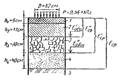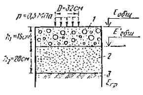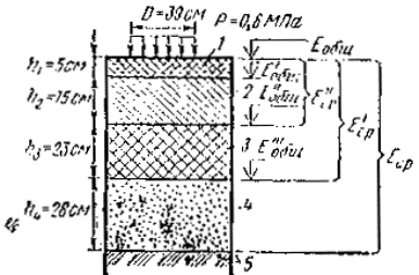 цементом, при Ккп = 0,66. Кт - коэффициент, учитывающий снижение прочности материала в конструкции в результате температурно-усадочных воздействий. Принимая во внимание малое число данных натурных наблюдении, для асфальтобетонов с учетом релаксации длительно действующих температурно-усадочных напряжений Кт = 1,0, для укрепленных неорганическими вяжущими каменных материалов Кт = 0,9, а для связных грунтов Кт = 0,8; m - показатель усталостной зависимости. Для теплого (плотного и пористого) и высокопористого асфальтобетона m = 0,27, для горячего (плотного и пористого) асфальтобетона m = 0,16, а для материалов и грунтов, укрепленных цементом, m = 0,06; N - интенсивность воздействия нагрузок от расчетных автомобилей, ед./сут, по одной полосе. В связи с недостаточной изученностью вопроса методы определения значений характеристик монолитных материалов по данным лабораторных испытаний следует рассматривать как приближенные. Определение модуля упругости грунтов и материалов в натурных условиях. Испытания проводят на реальных конструкциях, имеющихся на дорогах или создаваемых в натурном масштабе на полигонах и в грунтовых каналах. Модули упругости грунтов земляного полотна и неукрепленных каменных материалов слоев оснований определяют испытанием местным нагружением. Нагрузку на испытуемую конструкцию передают через круглый жесткий штамп с диаметром, близким к размеру усредненного следа колеса расчетного автомобиля (30 см £ D £ 34 см). Конструкции со слоями из монолитных или плотных слабосвязных материалов допускается испытывать с помощью сдвоенного пневматического колеса с профилем обода 203В, 216В, 228В. Наиболее точно модуль упругости грунта или материала устанавливают на однородной полупространственной конструкции, устроенной путем послойной укладки и уплотнения грунта или материалов при общей толщине не менее 40. В этом случае модуль упругости вычисляют непосредственно по результатам испытания. Модули упругости материалов слоев основания меньшей толщины определяют по результатам послойных штамповых испытаний. При испытании штампом, установленным на поверхности испытуемого слоя, определяют общий модуль Еобщ упругости конструкции, а при установке штампа на нижележащие слои Е2, затем по номограммам (рис. 29 и 30 на вкладке рис.) рассчитывают модуль упругости испытуемого слоя. Послойно следует испытывать конструкции с основанием, имеющим не больше двух слоев. Грунты и слои одежды в испытуемой конструкции должны быть уложены в соответствии с действующими правилами производства и приемки работ; они должны быть во всем массиве однородными по зерновому (гранулометрическому) составу, по показателям плотности и влажности. При этих условиях испытания можно проводить на дорогах после устройства и приемки земляного полотна и основания (до укладки покрытия), а также в процессе эксплуатации дороги при наличии достоверной информации об условиях ее строительства. Получаемые в этих случаях данные испытания относятся к состоянию конструкции в момент проведения испытания, обычно при влажности грунта и материалов основания меньше расчетной. Для того чтобы установить значения модулей упругости, соответствующие расчетному периоду (см. приложение 5), испытания следует приурочить к соответствующему моменту времени - весной, после дождей или специальн