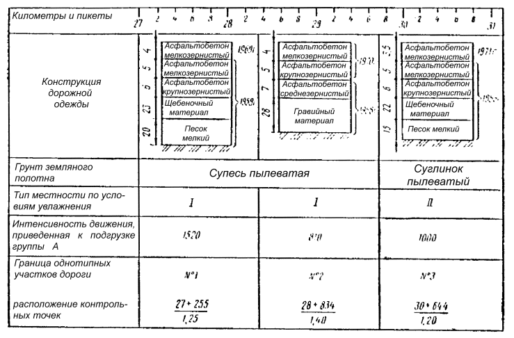 Рис. 14. Сводная ведомость паспортных данных обследуемой дороги: Числа на конструктивных слоях