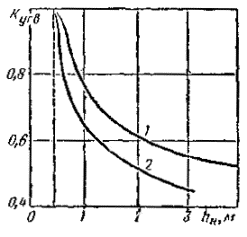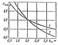 (26) где t - коэффициент нормированного отклонения, зависящий от заданного уровня надежности и числа точек, на которых произведены испытания (см. табл. 28). По вычисленным значениям прогиба lq и параметрам нагрузки определяют фактический модуль упругости одежды по формуле (16). Затем строят эпюру прочности дорожной одежды, на которую наносят фактический модуль упругости Еф и требуемый, в зависимости от интенсивности движения в момент испытания и на перспективу. ПРИЛОЖЕНИЕ 6МЕТОДИКА ИСПЫТАНИЯ ГРУНТОВ И МАТЕРИАЛОВ НА МОРОЗОУСТОЙЧИВОСТЬВ лабораторных условиях пригодность грунтов и материалов для устройства морозозащитных слоев устанавливают на основании результатов промораживания образцов, в процессе которого измеряют деформации морозного пучения. Показатель пригодности Кпуч, т.е. коэффициент пучения грунта или материалов представляет собой выраженное в процентах отношение вертикальной деформации пучения к первоначальной высоте образца. Условия испытания, характерные для работы грунтов и материалов в морозозащитных слоях дорожных одежд, установлены, исходя из следующих соображений: а) средняя скорость промерзания земляного полотна автомобильных дорог колеблется от 1-1,5 см/сут. для II и III дорожно-климатических зон Европейской части территории СССР и до 1,5-2,5 см/сут. для Сибири, а также Северного Казахстана и горных районов IV-V дорожно-климатических зон. Для обеспечения таких скоростей промерзания в лаборатории испытания ведут соответственно при температуре воздуха в камере от минус 3 до минус 5° С или от минус 5 до минус 8° С. При этом более низкие температуры принимаются для районов с более суровым континентальным климатом; б) влияние давления вышележащих слоев на вспучивание материала при промерзании и влияние глубины расположения грунтовых вод ориентировочно учитывают умножением коэффициента пучения Кпуч.л, получаемого в результате лабораторных испытаний, на коэффициенты Кнагр и Кугв, определяемые по графикам (рис. 18 и 19); Рис. 18. Зависимость коэффициента Кнагр от глубины hп промерзания от поверхности покрытия: 1 - супесь тяжелая и