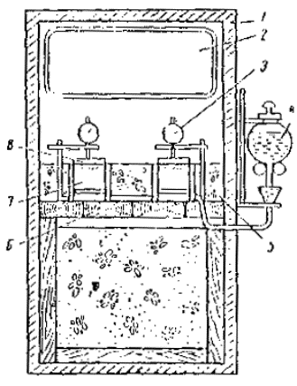 морозильная камера; 3 - индикаторы; 4 - подача воды к образцам; 5 - засыпка из