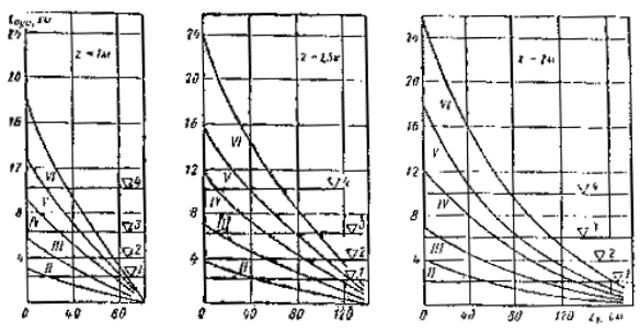 как для пылеватого песка, но с проверкой данных в лаборатории. Рис. 22. Номограммы для определения требуемой (по условию обеспечения морозоустойчивости) толщины дорожной одежды с морозозащитным слоем из песка: II-VI - кривые групп грунтов