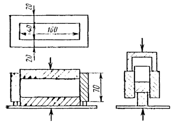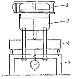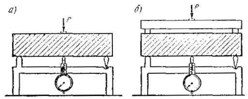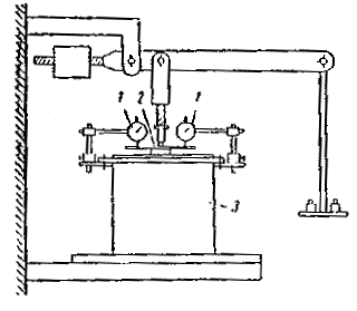2 - штамп с заплечиками; 3 - форма с образцом Эта формула учитывает различие в процессах формировании материала, в сопротивлении его деформированию, а также в режимах нагружения в лабораториях и натуре. Испытание образцов из материалов, содержащих неорганическое вяжущее. К таким материалам относятся цемент, известь, гранулированный шлак, зола-уноса и др. Сопротивление растяжению при изгибе и модуль упругости грунтов и материалов, укрепленных неорганическим вяжущим, определяют на образцах-балочках, которые изготавливают и хранят до испытаний по стандартной методике. Для каждого вида испытаний готовят по три образца. Образцы в зависимости от размера испытывают на прессах рычажных, гидравлических или с механической подачей поршня, способных передавать нагрузку 5-10 кН. Точность отсчета показаний силоизмерительного устройства пресса до 5 %. Прессы для испытаний образцов-балочек должны быть оборудованы дополнительными приспособлениями - специальными столами (подставками) или траверсами, несущими на себе цилиндрические опоры для балочек, при этом одна из опор должна быть подвижной. Радиус закругления опорных поверхностей должен быть в пределах 10-15 мм. В подставке имеется отверстие для крепления индикатора часового типа (см. рис. 27). Испытываемый образец после извлечения из воды вытирают мягкой тканью и помещают на две опоры подставки, расстояние между которыми равно 14 см для балочек размером 4´4´16 см и 30 см для балочек размером 10´10´40 см. Образец устанавливают на опоры той гранью, которая при изготовлении образца была вертикальной. Поверхность балочки должна прилегать к опорам плотно по всей ширине. Образец нагружают посередине пролета на всю ширину балочки. Под образец помещают прикрепленный к подставке индикатор часового типа для определения вертикального смещения (прогиба). После установки образца приступают к испытанию. Скорость нагружения образцов должна составлять 2-4 мм/мин. Предел прочности на растяжение при изгибе вычисляют по формуле (33), как среднее арифметическое результатов испытаний трех образцов; расхождение между результатами отдельных испытаний не должно превышать 15 %. Ориентировочные значения предела прочности на растяжение при изгибе можно получить по результатам испытания цилиндрических образцов на растяжение Rраск при расколе. В этом случае предел прочности на растяжение при изгибе Rизг.л @ 2 Rраск. (36) При определении модуля упругости образец нагружают ступенями, с разгрузкой после каждой ступени. Значение ступени нагрузки выбирают так, чтобы иметь три - пять ступеней в процессе испытания. Вертикальный прогиб fсумм балочки измеряют индикатором часового тина. Время действия каждой ступени нагрузки 1 мин, разгрузки 30 с. Для исключения местного упругого смятия образца в зоне его контакта с опорами испытания производят по схеме рис. 27. Модуль упругости определяют при нагрузке 0,5-0,7 от разрушающей нагрузки по формуле (30) при Кt = 1,0. С помощью одного и того же образца-оболочки можно одновременно с определением модуля упругости найти предел прочности на растяжение при изгибе. В этом случае испытывают ступенчато-возрастающей нагрузкой до разрушения балочки. Ступень нагрузки DР назначают в зависимости от предельной нагрузки Рпр, при которой фиксируется разрушение, исходя из условия DР £ 0,1 Рпр. За расчетную раз