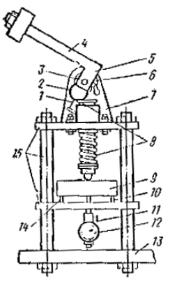 Рис. 25. Механизмы нагружения Установка питается переменным током общей сети, поэтому в электрическую схему введен стабилизатор напряжения и выпрямитель. Продолжительность действия нагрузок - 0,1 с, интервал между ними 1 с обеспечивается электромеханическим прерывателем электрического тока. Создаваемую электромагнитную нагрузку в зависимости от зазора между якорем и корпусом магнита тарируют и проверяют механическими динамометрами ДОСМ-3, ДОСМ-5. Для этого динамометр устанавливают на станине прибора до и после испытании таким образом, чтобы усилие or штока якоря передавалось на него так же, как и на испытуемый образец. Измерение нагрузок и деформаций аппаратурой с фиксацией сигналов невооруженным глазом (механические динамометры, индикаторы часового типа и др.) допускается при времени действия нагрузки не менее 0,1 с; при более кратковременных нагружениях используют аппаратуру с записью сигналов па осциллографах. Перемещения при кратковременном нагружении можно фиксировать тоже индикатором часового типа, снабженным винтом на его втулке. Поворотом этого винта создают трение между стержнем и втулкой, обеспечивают остановку стрелки индикатора при удалении нагрузки в том положении, и котором эта стрелка находилась в момент возникновения наибольшего перемещения (первый отсчет по индикатору). Затем стержень индикатора подводят вручную до соприкосновения с нижней гранью балочки и снимают второй отсчет по индикатору. По разности отсчетов вычисляют обратимое перемещение. Нагрузка должна вызвать напряжение, равное расчетному допускаемому, для ближайшего аналога испытуемому материалу. Она может быть также принята равной 0,2-0,3 от разрушающей нагрузки, установленной ранее испытанием образцов на прочность. Перед испытанием образцы выдерживают в течение 2 ч при заданной температуре, которую поддерживают и в процессе испытаний. Образцы боковой гранью укладывают на две опоры, удаленные друг от друга на расстояние 14 см. Одна из опор - подвижная, в виде шарнира, в частности, в виде шарнира-стойки. Часть опоры, соприкасающаяся с образцом, имеет цилиндрическую поверхность радиусом 5 мм. Нагрузку прикладывают к середине образца через стальную накладку с нижней цилиндрической (радиусом 10 мм) или плоской (шириной порядка 8 мм) поверхностью. Для удобства центровки образца около опор целесообразно устанавливать опоры, фиксирующие положение образца относительно опор, а подушку, передающую нагрузку па образец, связать с опорной станиной с помощью рычага и стойки. Вертикальный прогиб образца измеряют с помощью устройства, позволяющего из фиксируемого индикатором вертикального смещения исключать локальные деформации материалов на опорах (смятие). Устройство представляет собой навесную рамку, закрепляемую в местах предполагаемой нейтральной линии изгиба (посередине высоты балочки) над опорами или же на торцах образца. Рис. 26. прибор для испытаний образцов-балочек на изгиб повторными кратковременными нагрузками Рис. 27. Схемы для учета смятия балочки на опорах при испытании ее на изгиб а - для общего вертикального