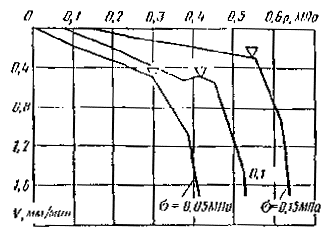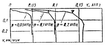 Рис. 36. Зависимость скорости деформирования V от сдвигающих напряжений t при испытании на приборе плоского сдвига (пример): р - удельная вертикальная