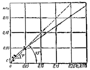 днище с отверстиями; 4 - патрубок Когда расчетная влажность грунта значительно выше оптимальной, образцы для испытания приготавливают, насыщая водой предварительно уплотненный до требуемой плотности грунт. Для этого металлическая форма должна иметь второе дно с отверстиями диаметром 0,5- 1 мм (см. рис. 32). В образующуюся полость вставляют два патрубка, к которым крепят резиновые трубки. Грунт укладывают в форму (поверх уложенной на дно с отверстиями фильтровальной бумаги) и уплотняют послойно до плотности скелета, вычисленной по формуле (44). Особенно тщательно нужно разрыхлять поверхность каждого слоя на глубину около 5 мм, чтобы разрушить образовавшуюся переуплотненную корку. В противном случае не будет достигнут равномерное по высоте насыщение образца водой. Для насыщения на один патрубок надевают резиновый шланг от резервуара с водой, устанавливаемого так, чтобы уровень воды находился на 20-50 см выше поверхности грунта в форме. На другой патрубок надевают шланг, прикрепленный к установленной вертикально стеклянной трубке. При этом нужно следить, чтобы между поверхностью воды в полости формы и дном с отверстиями не образовалась воздушная подушка. Образец насыщают до полного заполнения пор водой, что определяют периодическим взвешиванием формы с грунтом. Для насыщения требуется 2-5 сут. По окончании насыщения на шланги ставят зажимы, шланги отключают от источников питания водой, помещают форму с грунтом на сутки во влажный эксикатор, после чего образец испытывают на рычажном прессе. Нагрузку прикладывают через штамп, помещаемый в центре образца. Штамп имеет расположенные по диаметру заплечики, на которые устанавливают ножки индикаторов для замера вертикальных перемещений штампа (см. рис. 28). Перемещение центра штампа принимают равным полусумме отсчетов по индикаторам. Держатели индикаторов укрепляют на фасонных пластинках, привинченных к фланцу формы. Нагружают ступенями с разгрузкой после каждой ступени. Каждую ступень нагрузки выдерживают до затухания деформации (разница отсчетов по индикаторам - не более 0,01 мм за 5 мин). После того как зафиксирован отсчет по индикаторам, штамп разгружают и ожидают восстановления деформации (допуск тот же, что и при нагружении). Затем нагружают следующей ступенью, и так до достижения нагрузки, при которой начинают интенсивно развиваться пластические смещения в толще массива. Это обычно сопровождается значительным увеличением остаточной деформации. Ступени нагрузки выбирают такими, чтобы иметь три - пять ступеней в процессе испытания. На основе полученных значений обратимой деформации при каждой ступени нагрузки строят график зависимости упругой деформации грунта от давления по подошве штампа и по формуле (41) вычисляют модуль упругости при каждой ступени нагрузки. При испытании связных грунтов высокой влажности следует давать пригрузку вокруг штампа. Во избежание больших ошибок нельзя испытывать в лаборатории малыми штампами образцы слабосвязных зернистых материалов (гравий, щебень). Такие материалы следует испытывать штампами диаметром 25-35 см. При каждом значении влажности и плотности грунта должно быть испытано не менее шести образцов. Определение характеристик сопротивления грунтов и материалов сдвигу в лабораторных условиях. Поскольку в основу расчета грунтовых ос