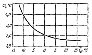 Характеристики, необходимые для расчета конструкций на прочность и морозоустойчивость, устанавливают, руководствуясь указаниями приложений 2 и 3. Приводимыми в табл. 32 расчетными значениями теплофизических характеристик разных материалов и грунтов следует пользоваться лишь при отсутствии приборов и оборудования для экспериментального определения этих характеристик. Расчетное значение коэффициента температуропроводности а = l/(сg), где l - коэффициент теплопроводности; с - удельная теплоемкость; g - объемная масса. ПРИЛОЖЕНИЕ 10ПРОГНОЗИРОВАНИЕ СРЕДНЕГОДОВОЙ ТЕМПЕРАТУРЫ ПОВЕРХНОСТИ ПОКРЫТИЯ И АМПЛИТУДЫ КОЛЕБАНИЙ ТЕМПЕРАТУРЫ В РАСЧЕТНОМ ГОДУПри отсутствии данных систематических измерении в районе, где будет построена дорога, среднегодовую температуру tп.ср поверхности покрытия и амплитуду Ап годового колебания температуры в расчетном году прогнозируют следующим образом. Вычисляют расчетные значения среднемесячной температуры воздуха самого холодного месяца (январь для Северо-Запада) tв.min = и самого теплого (июль) tв.max = где st - среднее квадратическое отклонение среднемесячной температуры воздуха, определяемое по графику (рис. 37); t - коэффициент нормированного отклонения, зависящий от надежности и числа лет наблюдении (см. приложение 5, табл. 28). Далее в самом холодном и самом теплом месяце определяют среднемесячную температуру поверхности покрытия tп.min = 4К1(p - 1)tв.min/(3p); (47) tп.mах = 4К2(p + 1)tв.mах/(3p); (48) где K1, К2 - коэффициенты, характеризующие влияние теплоизоляционною слоя на температуру поверхности покрытия. При асфальтобетонном покрытии и теплоизоляционном слое из пенопласта К1 = 1,33, а К2 = 1,125, при других материалах теплоизоляционного слоя - К1 = К2 =1,0. Среднегодовая температура поверхности покрытия в расчетном году Tп.ср = 0,5(tп.max + tп.min); (49) амплитуда колебания Aп = 0,5(tп.max - tп.min); (50) Рис. 37. Корреляционная зависимость между средним многолетним
