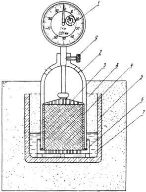 7 - вода; 8 - изоляционный материал (парафиновая паста); 9 - зажимной винт II. Порядок работы А. Подготовка образца к испытанию Определяют оптимальную влажность и максимальную