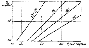 проводим вправо горизонтальную прямую до кривой N = 50 авт/сут.; от точки пересечения проводим вертикальную прямую
