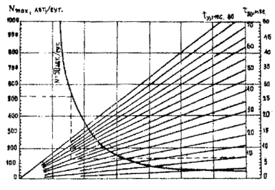 Рис. 1. Номограмма для определения интервала времени от начала работ до достижения заданной интенсивности движения по притрассовой автодороге. Пример. Определим интервал t50 при Nmax = 563