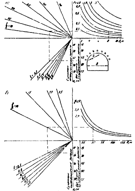 Hз = 5000 см; R = 350 см. Анкеры: α = 80 см; l = 280 см; Fα = 6 cм2; Eα = 2 · 106 кгс/см2; Набрызг-бетон: h = 10 см; En = 105 кгс/см2; Rсж = 400 кгс/см2. На рисунке приведены ориентировочные