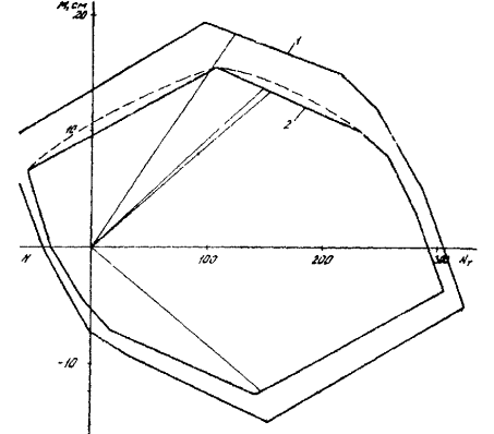 задаем K = 120000 кг/см3. Для проверки прочности строим диаграмму предельных усилий в данном сечении в осях «M-N», изгибающие моменты -