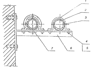 МПТ 1 - междуэтажная вставка из МПТ 2025; 2 - латунный тройник; 3 - вентиль; 4 - неподвижное крепление; 5 - подвижное крепление; 6 - гильза; 7 - междуэтажное перекрытие Рисунок 4 -