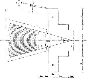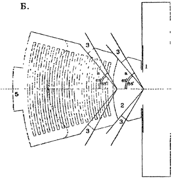 Схема размещения двух (а), трех (б), пяти (в) за экранных громкоговорителей.