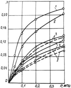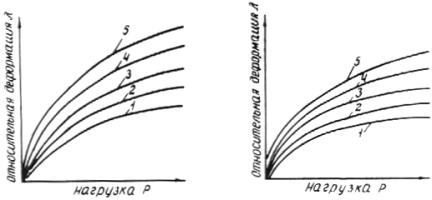 Зависимость относительной осадки от нагрузки при Kw = 1,4 (-------) и Kw = 1,2 (- - - - -): 1 - Kу = 0,75; 2 - Kу = 0,8; 3 - Kу = 0,85; 4 - Kу = 0,9; 5 - Kу = 0,95 В качестве примера результатов