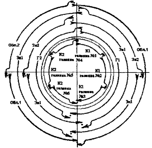 Состав основных технологических операций Трубы или трубные секции укладывают на бровке траншеи на инвентарных лежках под углом к оси траншеи таким образом, чтобы к торцам труб был свободный доступ. Расстояние от грунта до нижней образующей трубы для труб диаметром 1420 мм должно быть не менее 300 мм. В процессе раскладки необходимо провести осмотр труб, исправить или вырезать участки труб с поверхностными дефектами в соответствии с требованиями раздела 5 настоящего СП. 4.3.2. Подготовка и обработка торцов труб. 4.3.2.1. Обработку торцов труб с целью уменьшения площади поперечного сечения разделки производят кромкострогальными станками. 4.3.2.2. Для соединения труб с одинаковой толщиной стенки обработка должна быть произведена в соответствии со схемой, приведенной на рис. 4.3.1a. а) б) Рис. 4.3.1. Разделка кромок труб диаметром 1420 мм для двухсторонней автоматической сварки в защитных газах на оборудовании CRC-Evans AW а) для труб с одинаковой толщиной стенки; б) для разнотолщинных труб 4.3.2.3. При соединении разнотолщинных труб разделку более толстостенной трубы следует производить в соответствии со схемой, приведенной на рис. 4.3.16. 4.3.2.4. Прилегающие к торцам внутреннюю и наружную поверхности труб зачищают до чистого металла на ширину не менее 10 мм. 4.3.2.5. Следует зашлифовать «заподлицо» с поверхностью трубы наружное усиление продольного шва на длине от торца не менее 10 мм. 4.3.2.6. Перед обработкой торца после газовой резки следует зашлифовать «заподлицо» с внутренней поверхностью трубы внутреннее усиление продольного шва на длину не менее 50 мм от торца. 4.3.3. Установка на концах труб направляющих поясов для наружных автоматов. 4.3.3.1. Установку направляющих поясов производят с помощью специальных шаблонов. Направляющие пояса следует устанавливать на торец трубы, обращенный в сторону движения монтажной колонны. 4.3.4. Предварительный подогрев концов труб. 4.3.4.1. Подогрев стыкуемых концов труб производят с помощью установки индукционного подогрева. Температура стыка в момент начала сварки внутреннего корневого шва должна быть не менее 50 °С. 4.3.5.1. Сборку стыка производят с помощью специального внутреннего центратора. Центратор следует установить «на стык», отрегулировать положение сварочных головок относительно плоскости стыка и настроить параметры режима сварки. 4.3.5.2. Стык следует собирать без зазора. Допускаются локальные зазоры не более 0,5 мм. 4.3.5.3. Смещение кромок в собранном стыке рекомендуется допускать не более 2 мм. 4.3.6.1. Схема сварки стыка приведена на рис. 4.3.2. Рис. 4.3.2. Схема сварки стыка К - корневой слой, Г - «горячий проход», Зп -