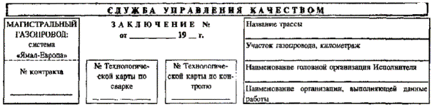 7. Название и краткая ______________________________________ характеристика процесса сварки, ______________________________________ предъявляемого к аттестации ______________________________________ 8. Количество сваренных стыков ______________________________________ 9. Диаметр и толщина стенки ______________________________________ трубы, класс прочности ______________________________________ 10. Разделка кромок ______________________________________ 11. Схема сварки шва (число ______________________________________ слоев, подварка) ______________________________________ 12. Марки сварочных материалов ______________________________________ риалов ______________________________________ 13. Род тока ______________________________________ 14. Положение сварки ______________________________________ 15. Предварительный подогрев ______________________________________ 16. Перечень используемого ______________________________________ оборудования ______________________________________ 17. Другие данные, в том числе ______________________________________ погодные условия при проведении ______________________________________ испытаний технологии ______________________________________ 18. Результаты аттестации: Аттестация технологии сварки проведена в соответствии с вышеупомянутой нормативной документацией; технология сварки рекомендуется к применению при строительстве участка газопровода __________________________________________ ________________________________________________________________________ (название и пикетаж участка) строительно-монтажной