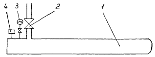 прохождения поршней Для сбора загрязнений используется камера приема поршней и загрязнений, представляющая собой, например, отрезок трубы диаметром 1420 мм, закрытый с одного конца сферической заглушкой и имеющий патрубок-отвод с арматурой диаметром 500 мм с другого конца, приваренного к очищаемому участку. Объем камеры приема должен быть достаточным для сбора ожидаемого количества загрязнений и размещения трех поршней. Принципиальная схема такой камеры приема поршней и загрязнений при продувке представлена на рис. 6. Движущиеся в потоке загрязнения при соударении с заглушкой оседают в камере приема, а воздух (газ) через патрубок-отвод выходит в атмосферу. Рис. 6. Принципиальная схема камеры приема поршней и загрязнений при продувке: 1 - труба с заглушкой; 2 - патрубок-отвод с краном; 3 -