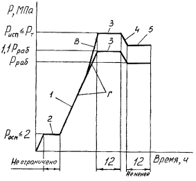 газопровода Рисп = 1,1 Рраб); 4 - снижение давления; 5 -
